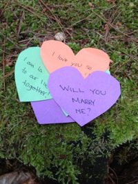 I wanted to let you know that Mark and I are getting married in 5 1/2 weeks. Mark surprised me with all these paper hearts at the cottage (see photo), all with nice messages - luckily I didn't see the "Will you Marry Me" one, or the ring, until the end!